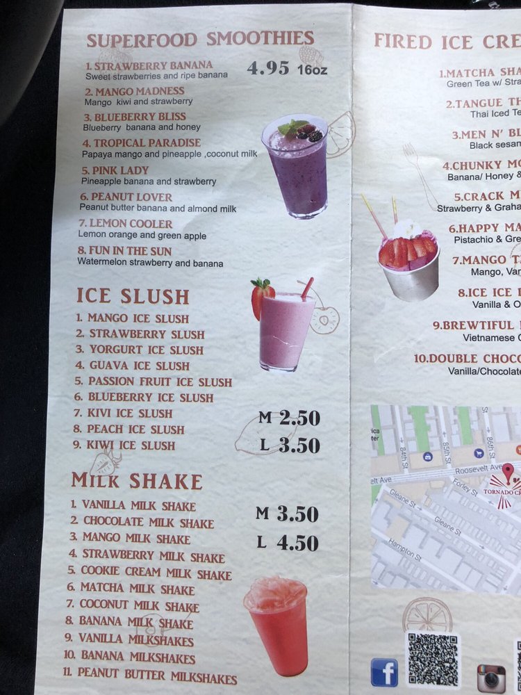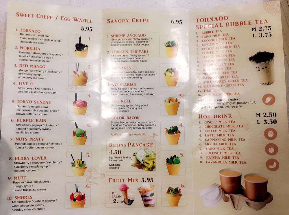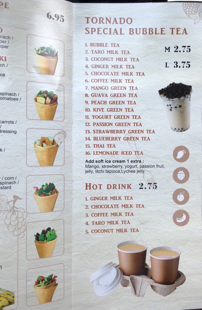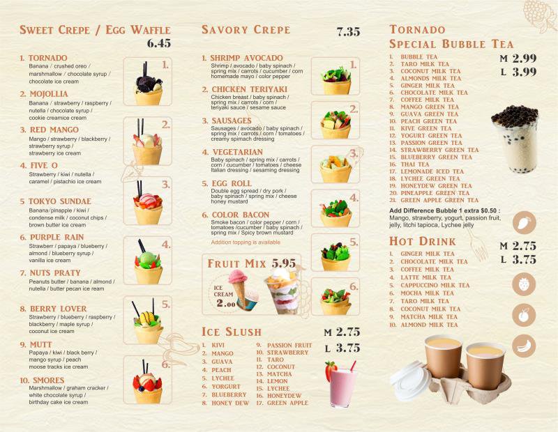 The menu at Tornado Crepe features a diverse selection of smoothies like the refreshing Tropical Paradise and the indulgent Peanut Lover. Their milkshakes and slush options are equally enticing, with flavors like Strawberry, Chocolate, and Mango to satisfy any sweet tooth. The Tornado Special Tea menu boasts a range of flavorful beverages, from the classic Bubble Tea to the exotic Passion Fruit Green Tea.