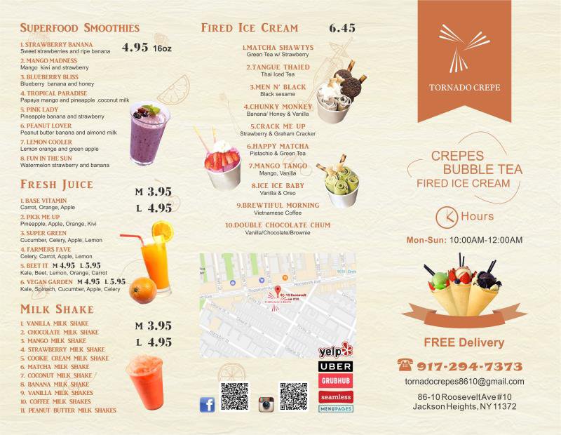 Tornado Crepe, located in Jackson Heights, offers a tantalizing array of options ranging from savory crepes to delightful smoothies and milkshakes. Customer favorites include the Strawberry Banana smoothie and the Tornado Special Teas. The cozy atmosphere, indoor and outdoor seating, and affordable prices make it a must-visit spot for crepe lovers. With generous toppings and unique flavor combinations, Tornado Crepe provides a satisfying culinary experience that will keep you coming back for more.